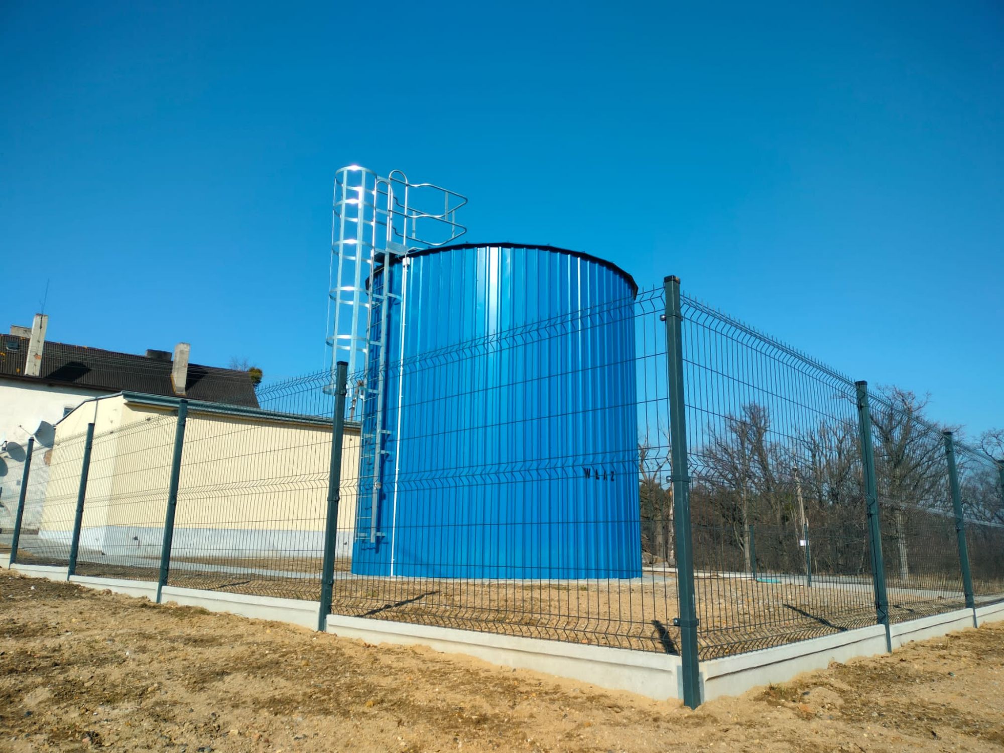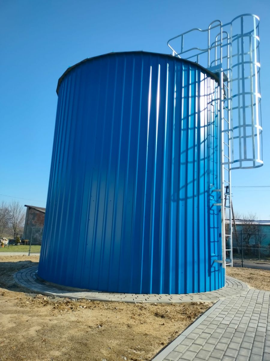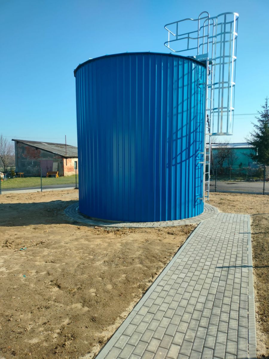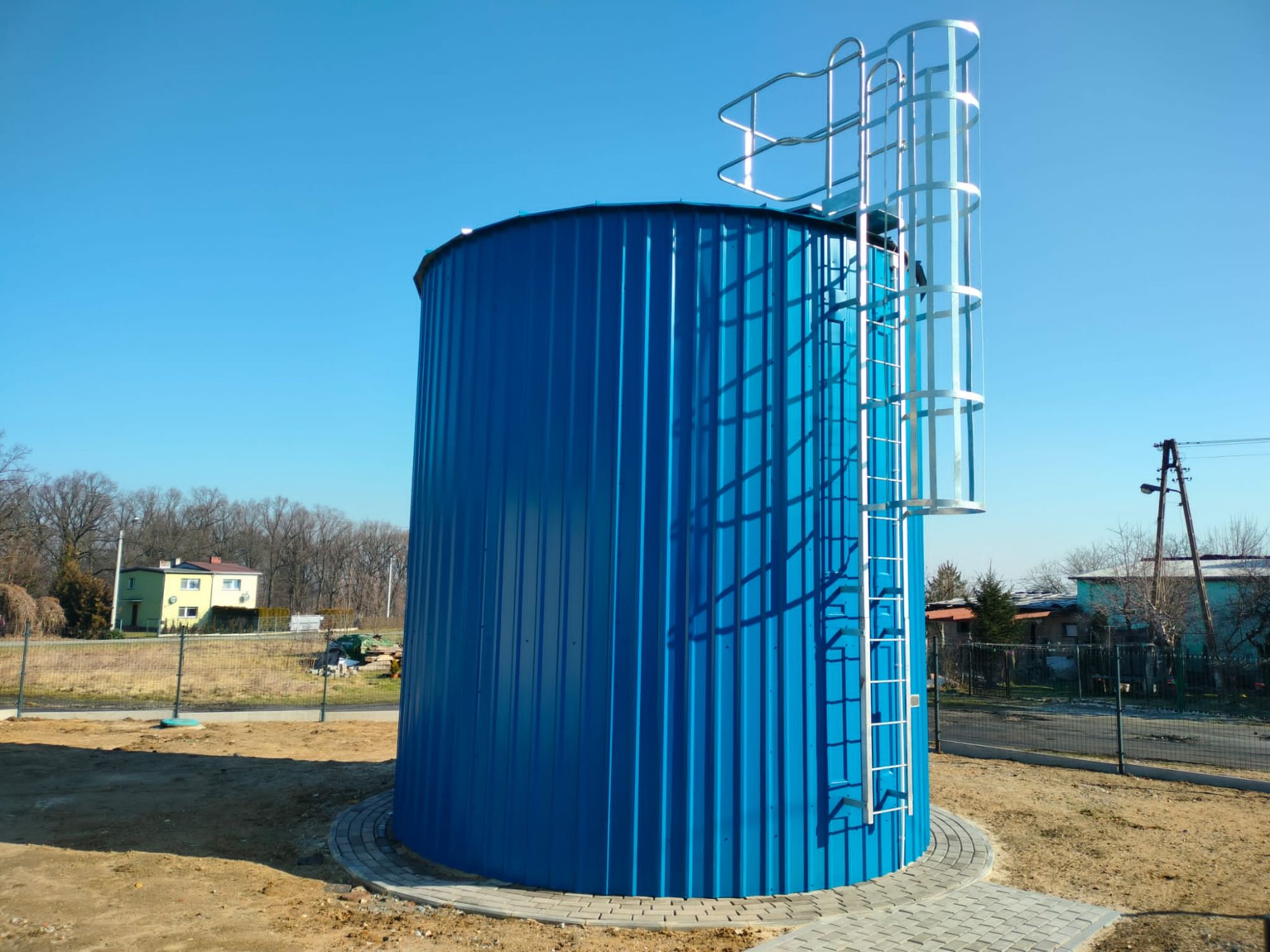 Zlikwidowano istniejący i zamontowano nowy, stalowy zbiornik wody czystej o pojemności 75m3 termicznie izolowany i zabezpieczony zewnętrznym płaszczem ochronnym.