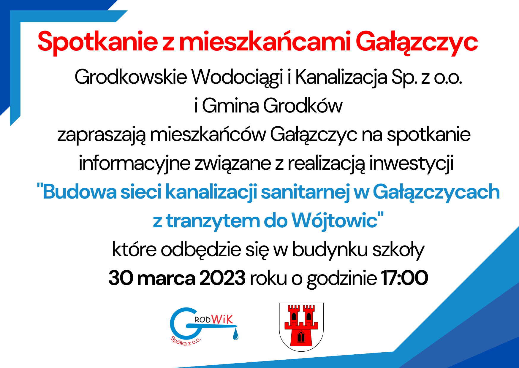 Grodkowskie Wodociągi i Kanalizacja Sp. z o.o. i Gmina Grodków zapraszają mieszkańców Gałązczyc na spotkanie informacyjne związane z realizacją inwestycji "Budowa sieci kanalizacji sanitarnej w Gałązczycach z tranzytem do Wójtowic", które odbędzie się w budynku szkoły 30 marca 2023 roku o godzinie 17:00.
