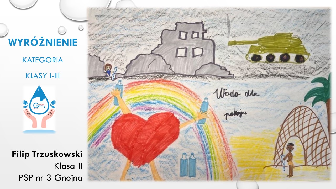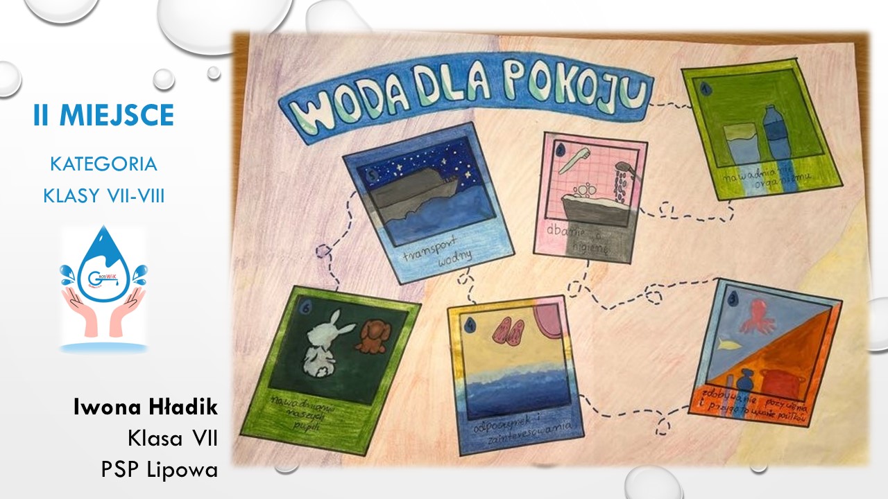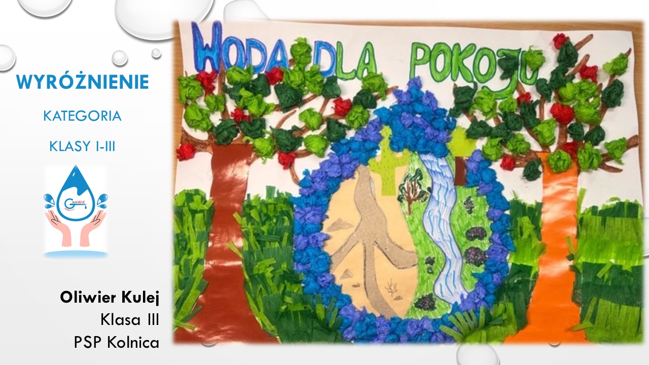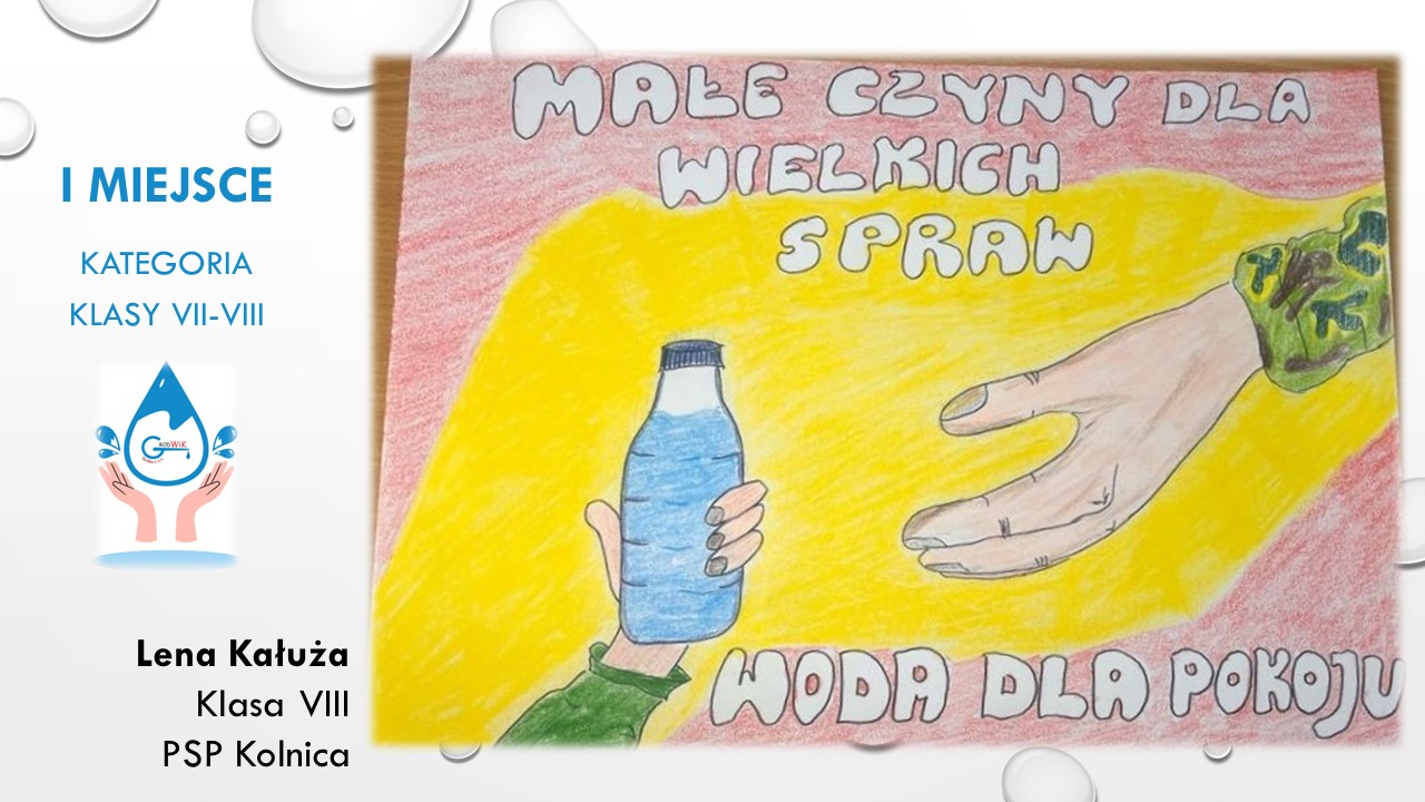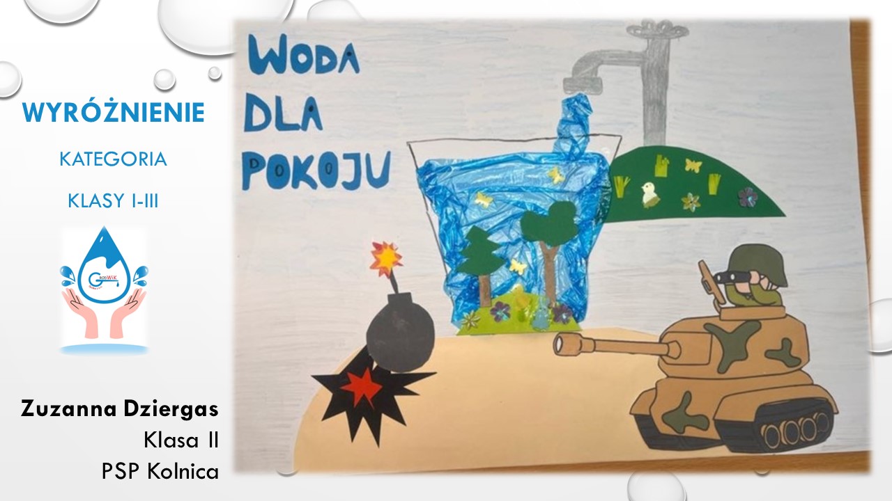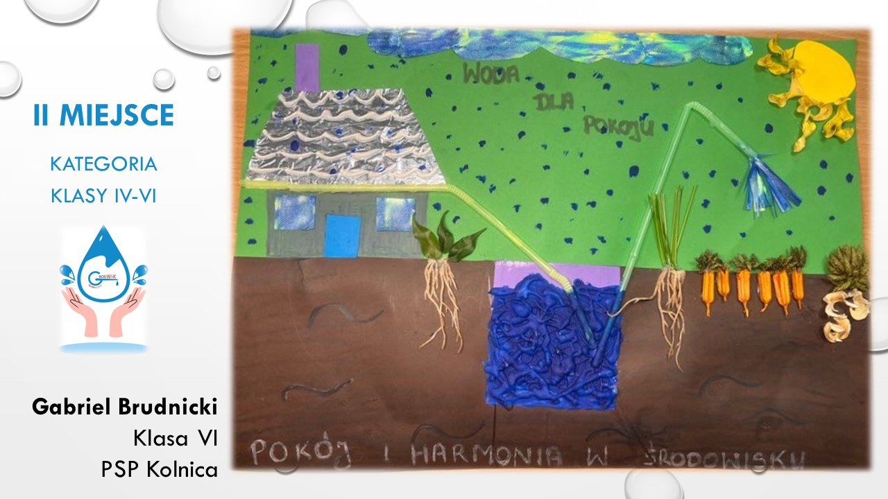 Konkurs plastyczny „Woda dla pokoju” był adresowany do uczniów szkół podstawowych w Gminie Grodków. Głównymi założeniami konkursu było kształtowanie postaw proekologicznych dzieci i młodzieży oraz pogłębienie świadomości na temat roli wody w życiu, ponieważ dostęp do czystej wody to prawo człowieka a na świecie aż 785 milionów ludzi nie ma dostęp do bezpiecznej wody pitnej!