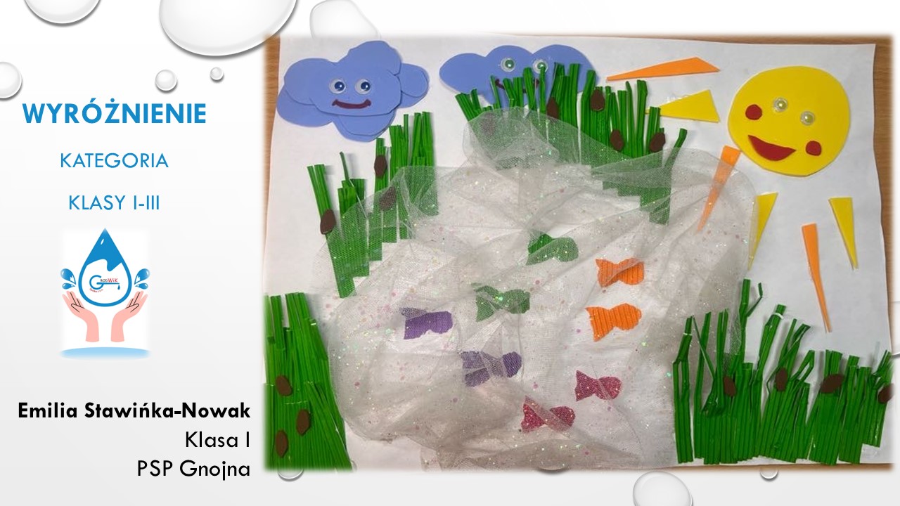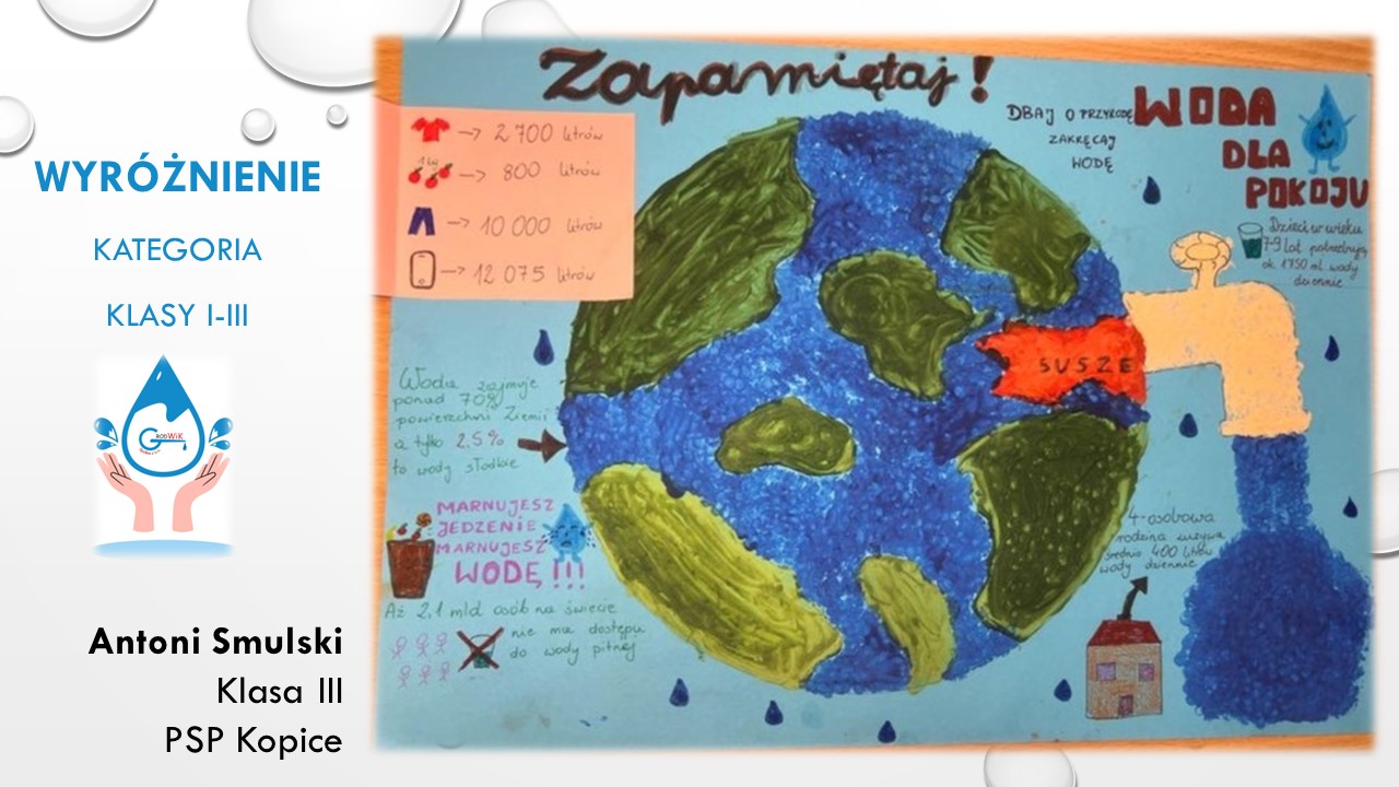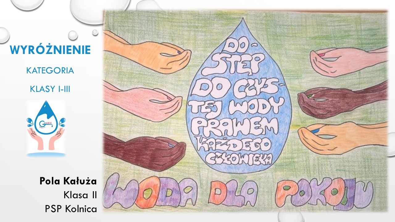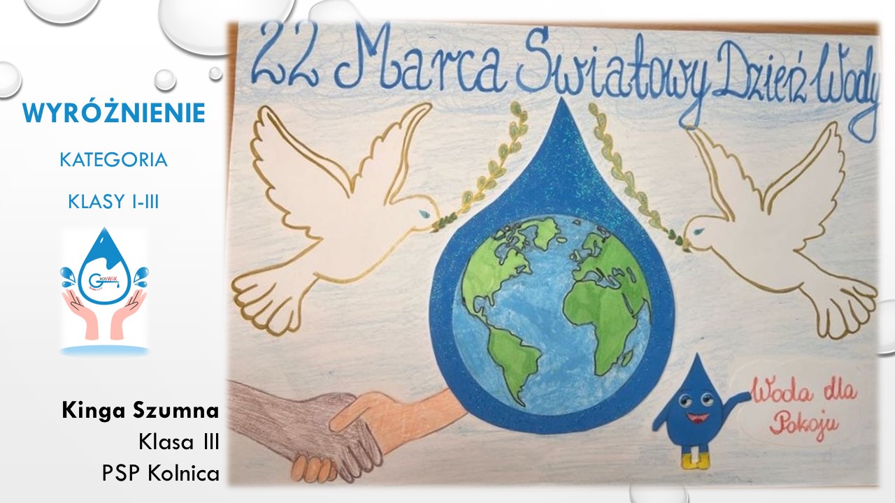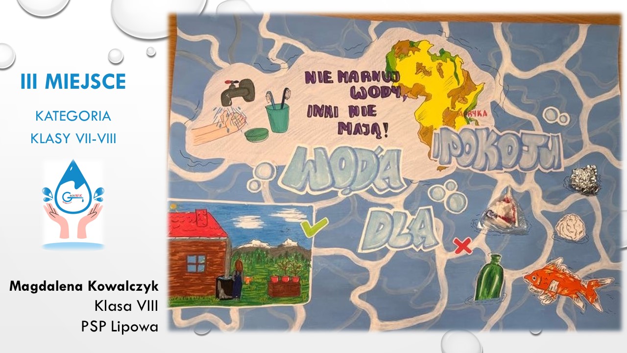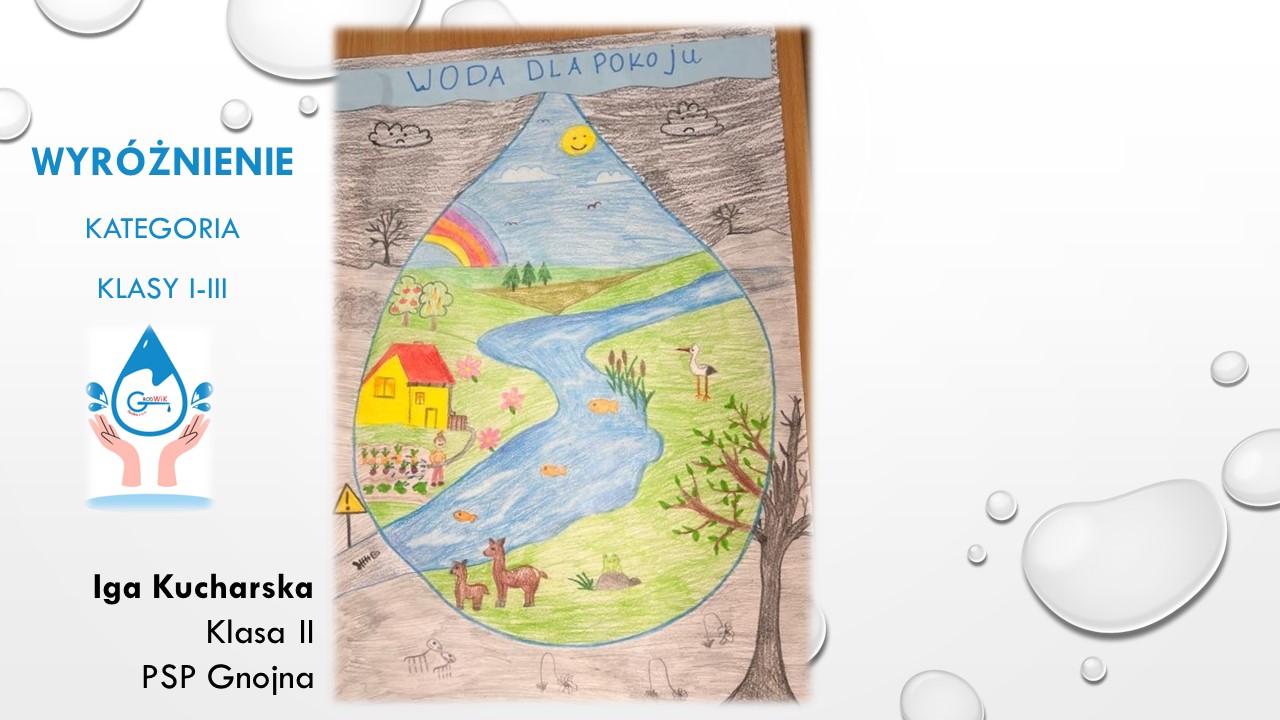 Konkurs plastyczny „Woda dla pokoju” był adresowany do uczniów szkół podstawowych w Gminie Grodków. Głównymi założeniami konkursu było kształtowanie postaw proekologicznych dzieci i młodzieży oraz pogłębienie świadomości na temat roli wody w życiu, ponieważ dostęp do czystej wody to prawo człowieka a na świecie aż 785 milionów ludzi nie ma dostęp do bezpiecznej wody pitnej!