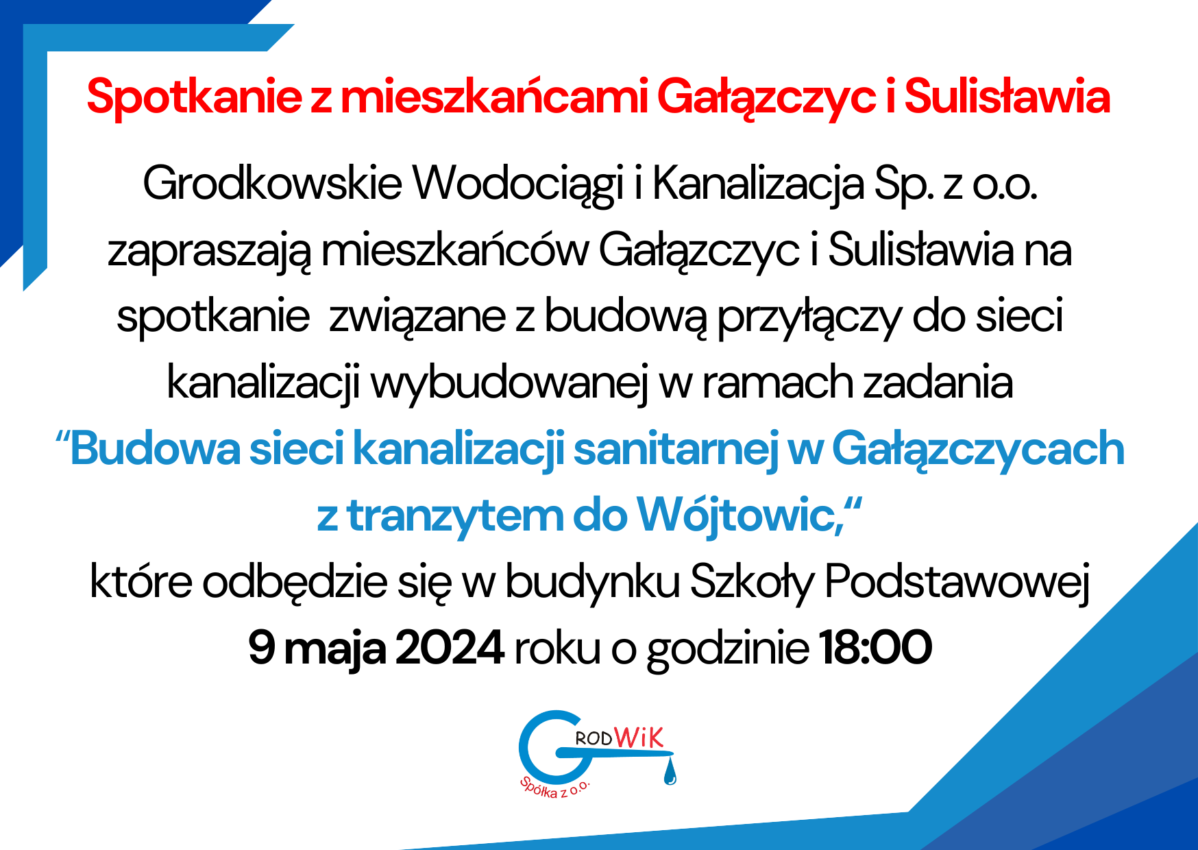 Grodkowskie Wodociągi i Kanalizacja Sp. z o.o. zapraszają mieszkańców Gałązczyc i Sulisławia na spotkanie związane z budową przyłączy do sieci kanalizacji wybudowanej w ramach zadania “Budowa sieci kanalizacji sanitarnej w Gałązczycach z tranzytem do Wójtowic,“ które odbędzie się w budynku Szkoły Podstawowej 9 maja 2024 roku o godzinie 18:00.